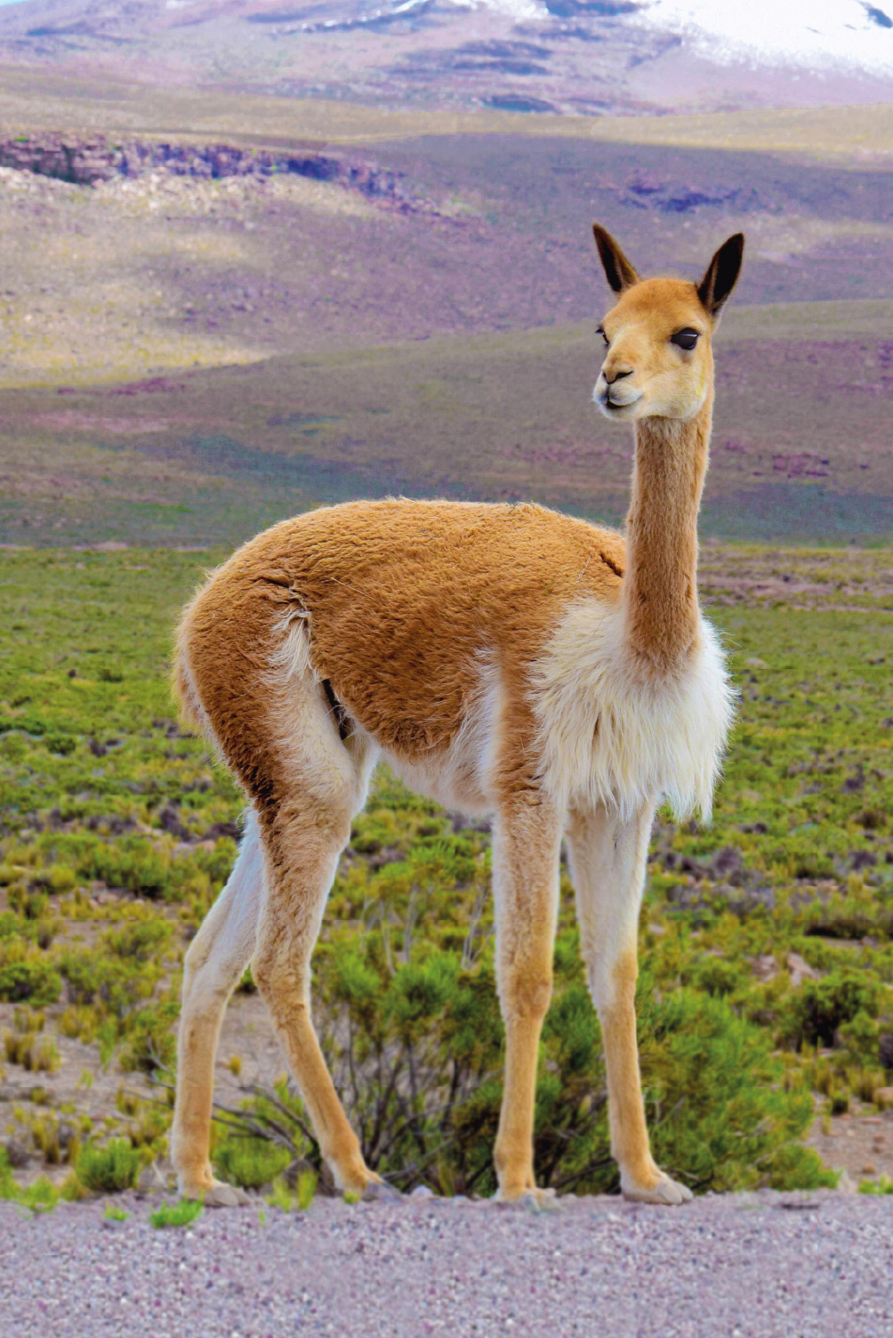 Camélido de apariencia elegante y cuerpo esbelto. Vive en las Cordilleras y Altiplanos de los países Andinos. Está cubierto por una capa de pelo largo y suave que lo abrigan del frío. Su fibra es de color marrón y rojizo siendo la más fina que la fibra de Alpaca. En el Perú es una especie protegida en peligro de extinción.
