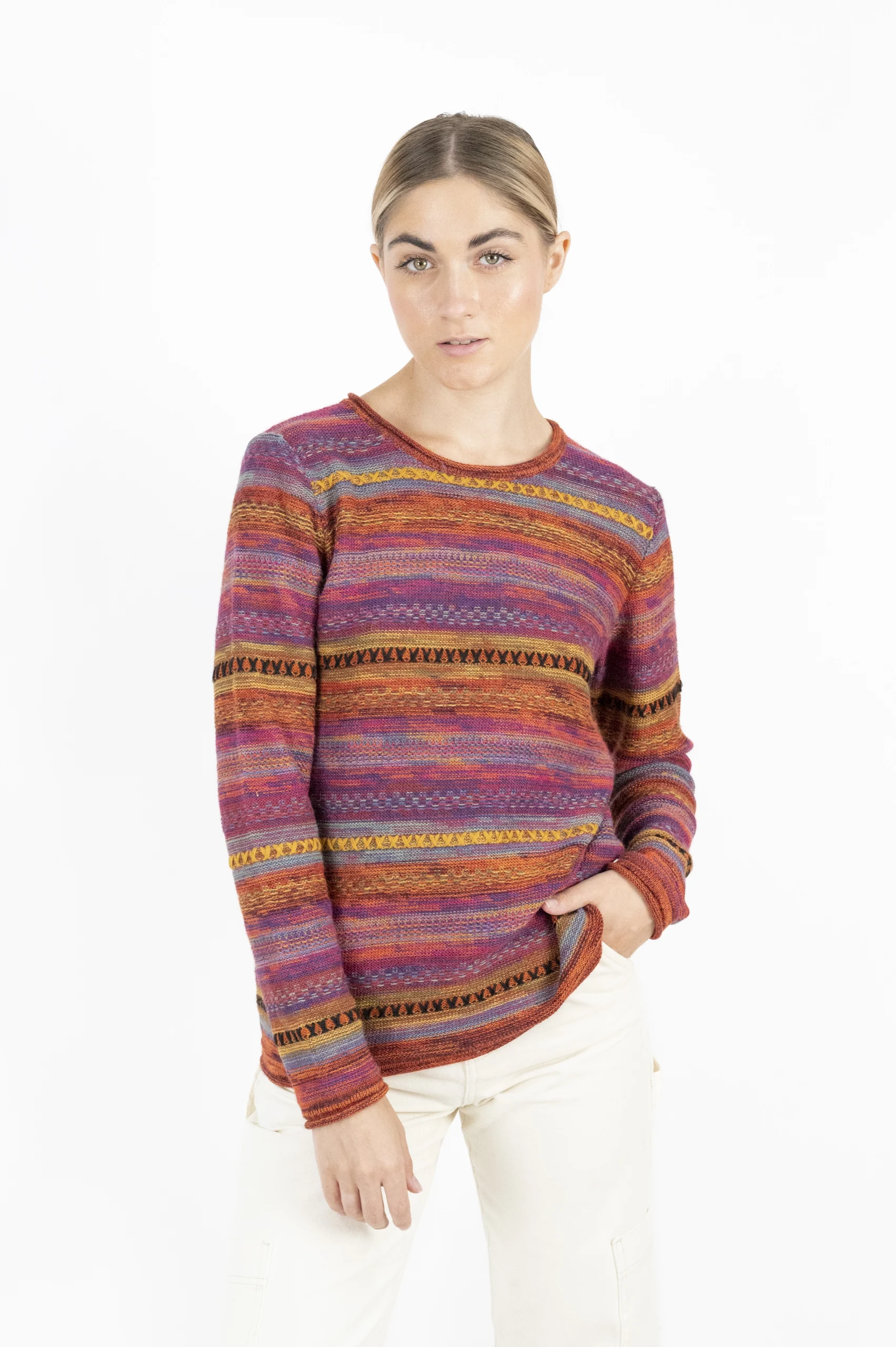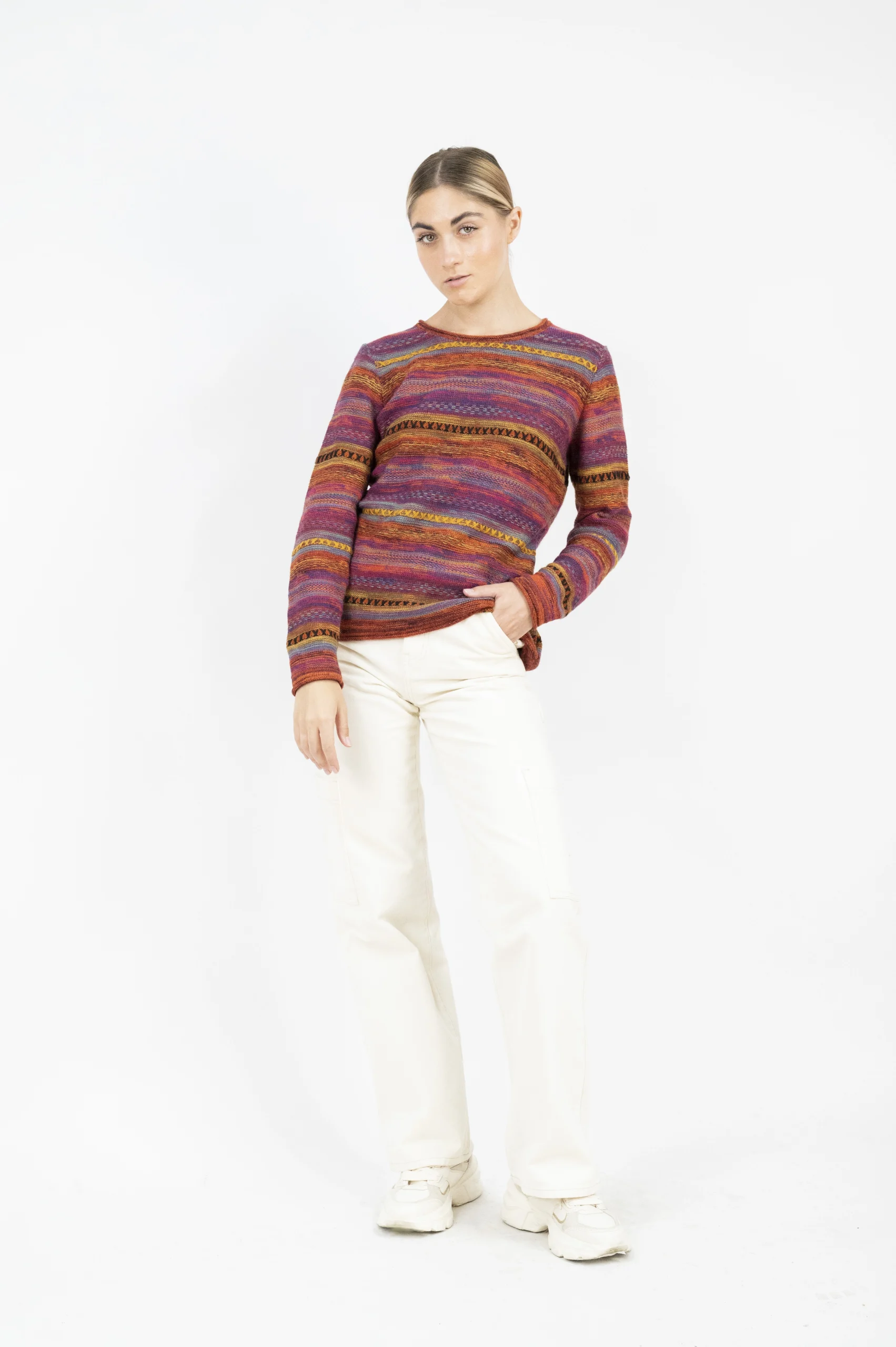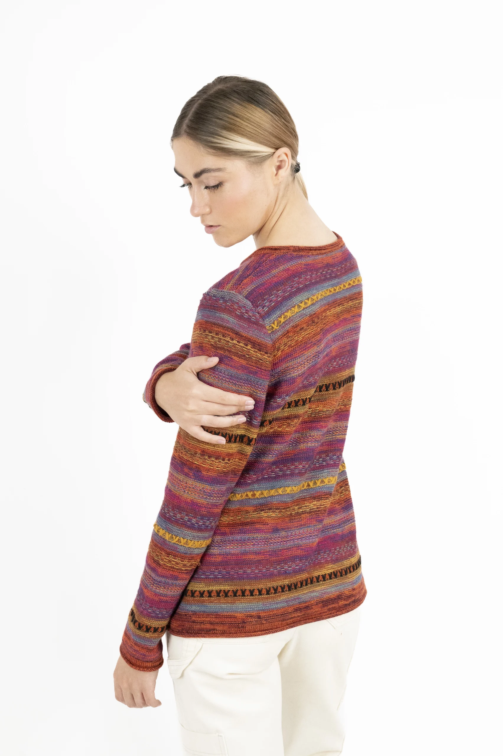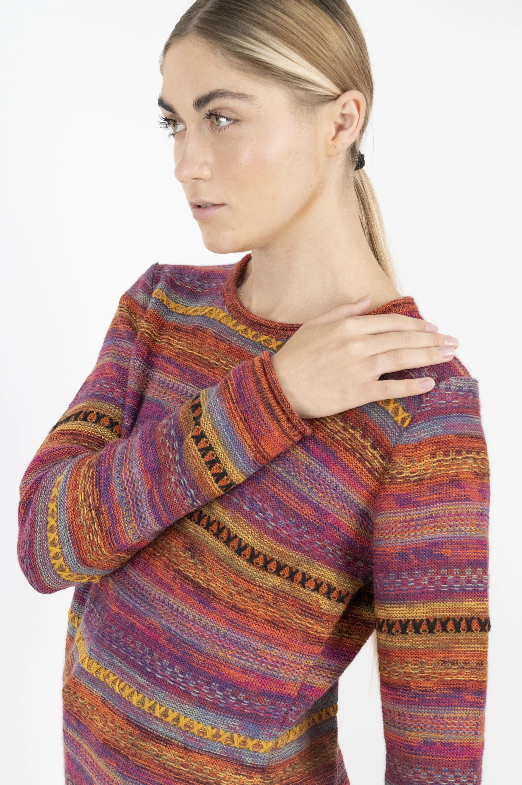 Nuestro suéter Alexandra está inspirado en vivos y alegres colores andinos, elaborado en 100% baby alpaca y detallado con cuello redondo.